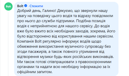 “Подібна позиція водія неприйнятна для нашого сервісу. До водія вже було вжито всіх необхідних заходів, зокрема, він був усунений від користування нашим сервісом. Компанія Bolt регулярно інформує водіїв про обмеження використання музичного супроводу без згоди пасажирів, а також повну утримання від відтворення музики будь-яких російських виконавців“, — зазначили в Bolt.