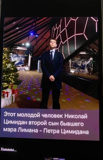 Спираючись на слова користувачів мережі, паблік пише, що другий молодик – це Микола Цимідан, син ексголови Лиману Петра Цимідана. Цей чоловік нібито у 2014 році привозив до міста російських бойовиків і селив їх у своєму готелі.