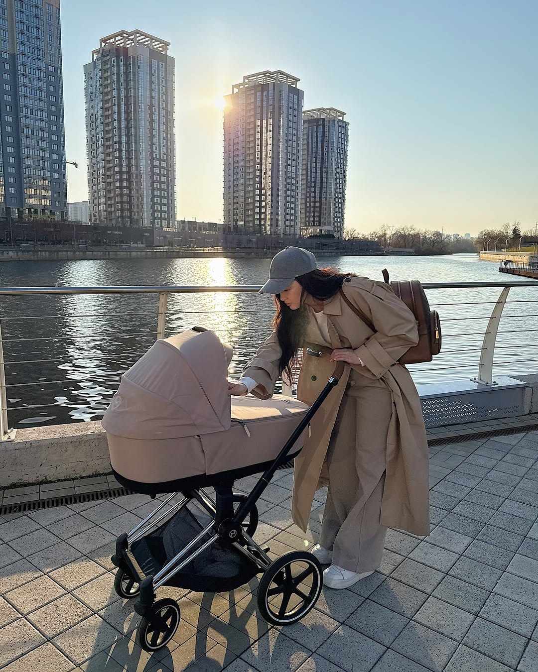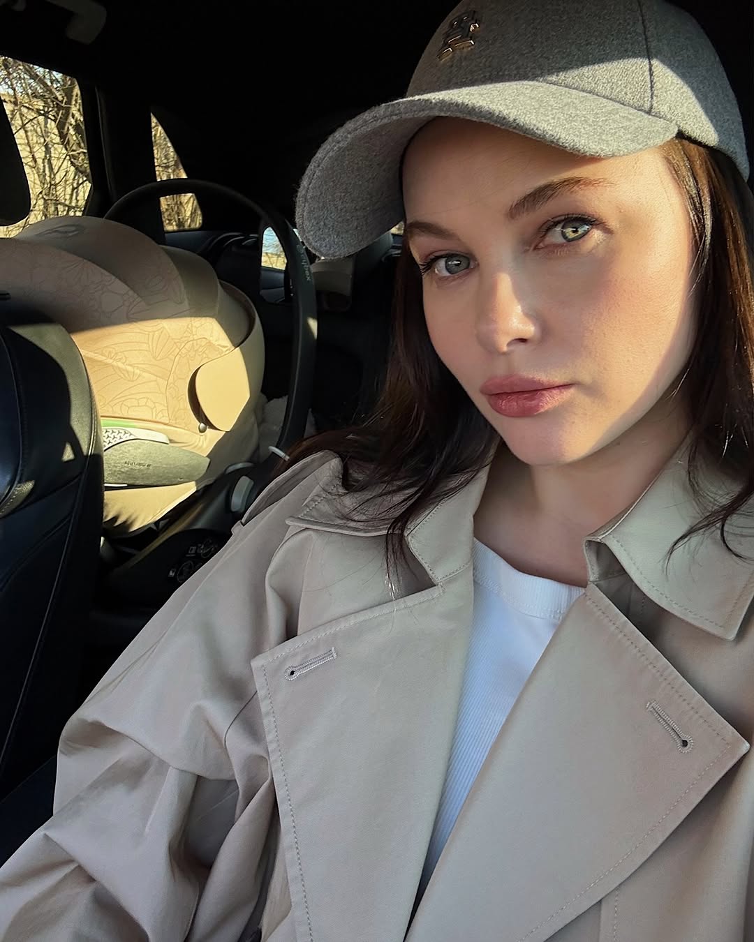 Під плащ молода мама одягла білий лонгслів і широкі джинси пісочного відтінку. Завершити стильний лук вона вирішила білими кедами на масивній підошві, кепкою сірого кольору і шкіряним рюкзаком коричневого відтінку.