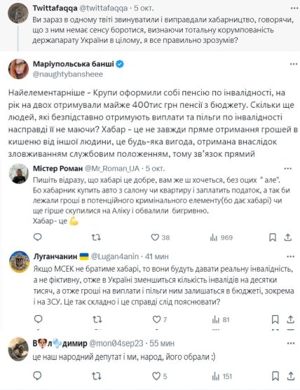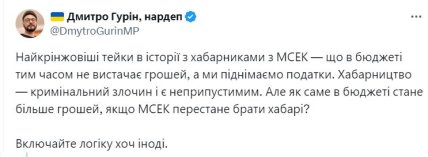 “Найкрінжовіші тейки в історії з хабарниками з МСЕК — що в бюджеті тим часом не вистачає грошей, а ми піднімаємо податки. Хабарництво — кримінальний злочин і є неприпустимим. Але як саме в бюджеті стане більше грошей, якщо МСЕК перестане брати хабарі?”, — Написав він і закликав людей “включати логіку”.