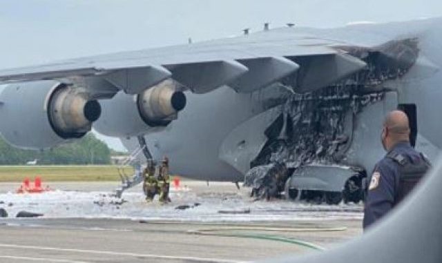 Транспортный самолет C-17 Globemaster III ВВС США загорелся на взлетно-посадочной полосе Объединенной базы Чарльстон в пятницу днем.