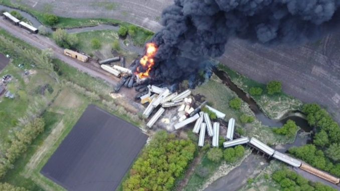 В США товарный поезд с опасными химикатами потерпел крушение из-за разрушения моста. Вагоны загорелись, жителей городка неподалеку эвакуировали.