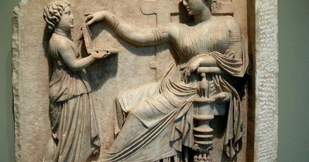 Статуя під назвою «Могильний найскус жінки на троні зі служницею» зображує заможну жінку, яка торкається кришки плаского складного предмета, який тримає перед нею дівчина-рабиня.