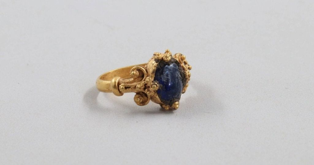 Перстень невеликого розміру і, ймовірно, належав жінці високого соціального статусу. Він прикрашений філігранною роботою та великим синім каменем, який поки що досліджують — це може бути як сапфір, так і кольорове скло.