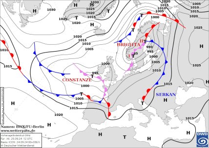 Синоптикиня Наталя Діденко на своїй сторінці у Фейсбук пише, що атмосферний фронт із заходу, повʼязаний зі скандинавським циклоном Brigitta, вона каже, що він “залицятиметься завтра до України”.