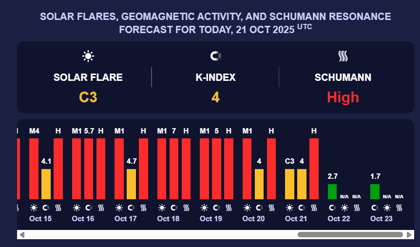 Сьогодні, 22 жовтня, очікується слабка магнітна буря. Вона матиме К-індекс 2,7, що відповідає зеленому рівневі. Магнітосфера буде стабільною та спокійною.