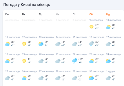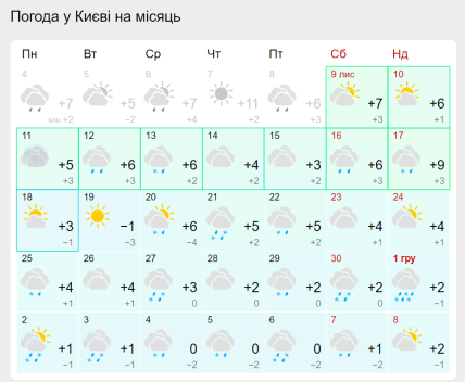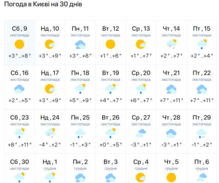 Прогноз сайту pogoda.meta.ua підтверджує морози у Києві ночами з 18 по 20 листопада. Цей прогноз навіть “морозніший” за попередній, адже за ним мінусова температура прогнозується також ночами 23, 24, 25, а також з 27 по 30 листопада.