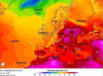 “В Україну через тиждень, орієнтовно з 13-14 серпня, повернеться сильна спека. Температура повітря може досягати +32+37 градусів, подекуди вище. Тут на прогностичній карті на 15 серпня навіть з’явилися +40 градусів (див. карту)”, — наголосила Діденко.