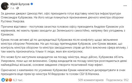 Олії у вогонь підлила ще й резонансна публікація головреда “Цензор.НЕТ” Юрія Бутусова, який, посилаючись на власні джерела, заявив, що Офіс президента нібито готує відставку віце-прем’єрміністра з відновлення – міністра розвитку громад, територій та інфраструктури Олександра Кубракова, “а на його місце планується призначення чинного міністра оборони Рустема Умєрова”.