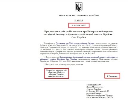 При цьому ситуація триває вже далеко не перший місяць. Наприклад, те ж саме було з наказом “Про внесення змін до Положення про Центральний науково-дослідний інститут озброєння та військової техніки Збройних сил України” від 27 лютого.