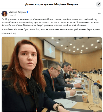 Нардепка описала, що Порошенко начебто підійшов до неї “з налитими кров’ю очима” та висловив погрози щодо її статусу в делегації. Реакція експрезидента на згадку про торгівлю з Росією, за словами Безуглої, виявилася особливо гострою.