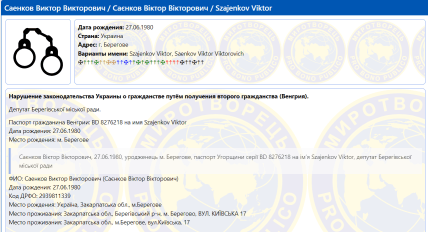 Там зазначається, що депутат Берегівської міської ради Саєнков має паспорт Угорщини серії BD 8276218. Документ було видано на ім’я Szajenkov Viktor.
