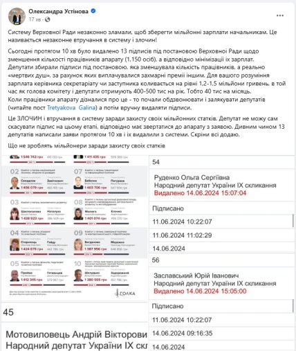 “На реєстрації знаходився проєкт постанови щодо зменшення зарплат працівників апарату Верховної Ради, які зараз отримують мільйони, і це не жарт… Кількість підписантів була біля 100, коли підписи почали зникати з проєкту. Фізично зникати. Так зникло 13 підписів протягом 10 хвилин, що технічно неможливо зробити без втручання в систему”, – написала Третьякова.
