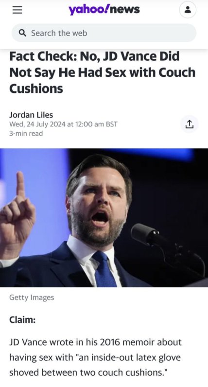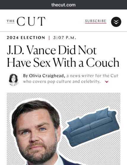 “І вже пох@й, що він нічого такого не казав, пох@й, що це просто тупа та абсурдна історія – меми несуться, республіканські ЗМІ слідом за демократичними вимушені писати статті-спростування в стилі “Ні, Джей Ді Венс не їб@в диван”, а сам високодуховний кандидат на посаду ВП банить у твіттері користувачів за будь-які картинки чи відео з диванами”.