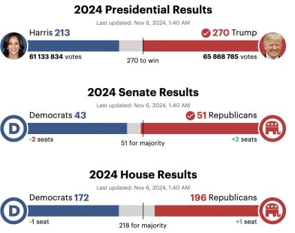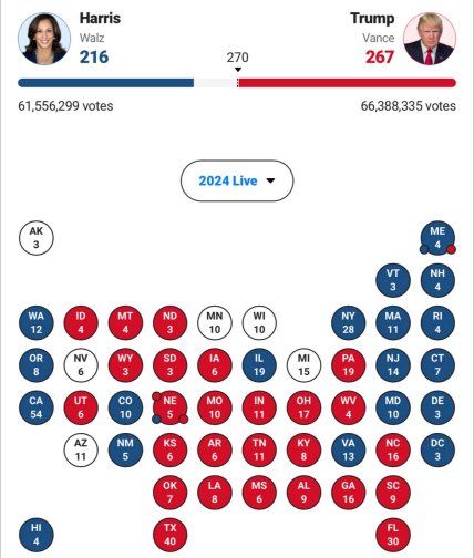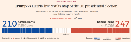 Останній штат Аляска закрив свої виборчі дільниці у США о восьмій ранку, 6 листопада (за Київським часом). На цю годину у Трампа було 247 голосів проти 210 голосів Камали Гарріс. Для перемоги майбутньому президенту достатньо було набрати 270 голосів.