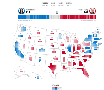 Камала Гарріс перемогла в окрузі Колумбія, штатах Колорадо, Іллінойс, Нью-Йорк, Вермонт, Массачусетс, Коннектикут, Нью-Джерсі, Род-Айленд, Меріленд, Делавер, Вашингтон, Каліфорнія, Орегон, Нью-Мексико, Вірджинія.