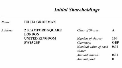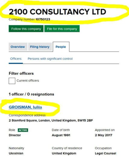 У травні 2017 року Юлія зареєструвала компанію під назвою 2100 Consultancy Ltd зі статутним капіталом 1 фунт стерлінгів (на момент публікації матеріалу — 54,09 грн за курсом НБУ). Дівчина, якій на той момент було 25 років, стала директором та єдиним власником лондонської фірми.