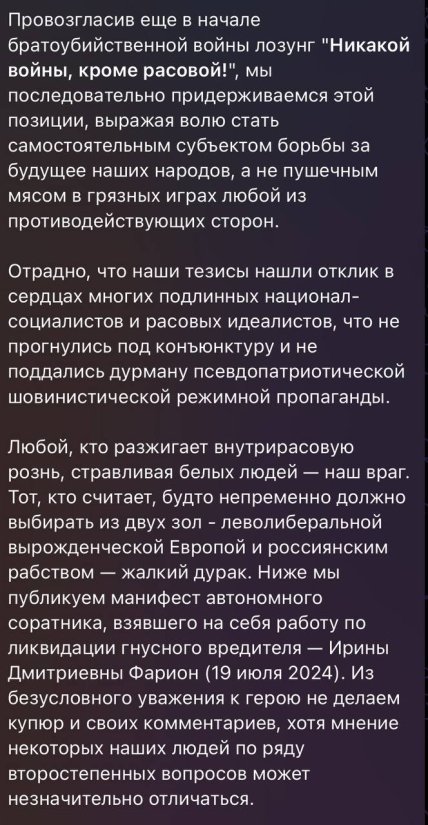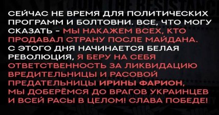 У мережі з’явилася інформація, що відповідальність за вбивство екснардепа Ірини Фаріон взяла на себе російська неонацистська організація NS/WP (National-Socialism/White Power). Вона нібито звинуватила Фаріон у розпалюванні “внутрішньорасової ворожнечі”.