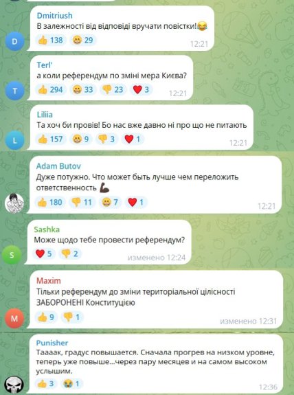 Кличко припустив, що в цьому випадку Зеленському довелося б вдатися до референдуму, оскільки він не зможе без народної підтримки досягти важливих угод. При цьому мер столиці зазначив, що можливим виходом із ситуації було б створення уряду національної єдності, на зразок того, який був створений в Ізраїлі після нападу ХАМАС.