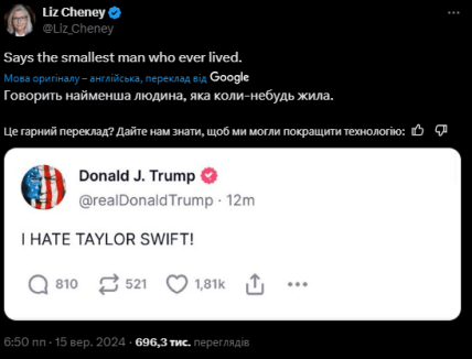 Колишній представник Конгресу від Республіканської партії, яка підтримує Гарріс, Ліз Чейні написала в Х: “Говорить найменша людина, яка будь-коли жила“, посилаючись на трек з останнього альбому Свіфт The Tortured Poets Department.