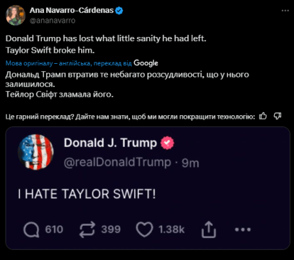 Стратег і коментатор Республіканської партії, яка є затятим критиком Трампа, Ана Наварро пише, що “Дональд Трамп втратив залишки здорового глузду. Тейлор Свіфт зламала його“.