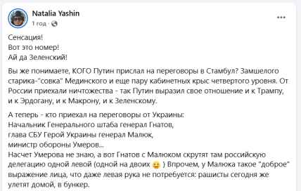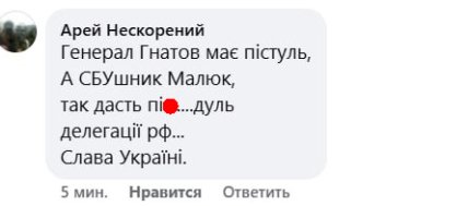 “Щодо Умєрова не знаю, а ось Гнатов із Малюком скрутять там російську делегацію однією лівою (однією на двох). Утім, у Малюка такий “добрий” вираз обличчя, що навіть ліва рука не буде потрібна: росіяни сьогодні ж полетять додому, у бункер”, — написала одна блогерка.