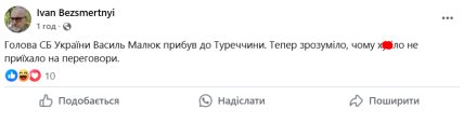 Український блогер додав своє комічне припущення: “Тепер зрозуміло, чому Путін не приїхав на переговори” — мовляв, злякався керівника Служби безпеки.