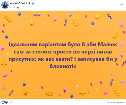 Політики теж не стримують жартів. Депутат Андрій Осадчук уявив, як Малюк на переговорах просто по черзі питає кожного за столом: “Як вас звати?” — і занотовує в блокнот.