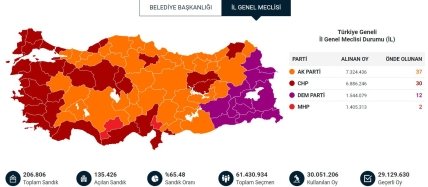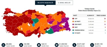 Як мовиться на онлайн-табло місцевого каналу NTV, чинний мер Стамбула Екрем Імамоглу має понад 50% підтримки, а мер Анкари Мансур Яваш уже повідомив про перемогу, попри те, що підрахунок голосів продовжується.