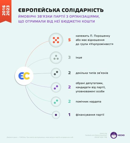 Так, “Європейська солідарність” протягом 7 років витратила понад 167 мільйонів гривень державного фінансування на закупівлю товарів і послуг у 15 товариств, які були пов’язані з нею напряму. Зокрема, 5 із них належали Порошенко особисто, або були пов’язані з групою “Укрпромінвест”, де ключовою особою також є Порошенко.