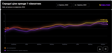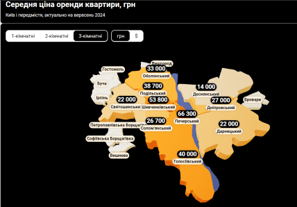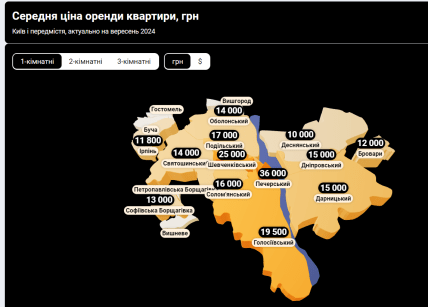 Найдоступніші ж для оренди однокімнатні квартири можна знайти в Дніпровському (15 000 гривень), Святошинському (14 000 гривень) та Деснянському (10 000 гривень) районах столиці.