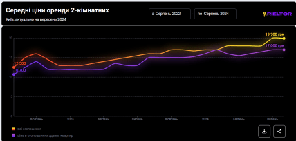 Вартість оренди 2-кімнатної квартири у Києві становить у середньому 20 тисяч гривень на місяць. За останні півроку ціна на оренду двокімнатної квартири в столиці зросла на 17%.