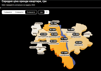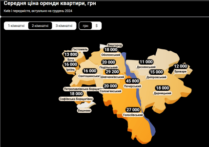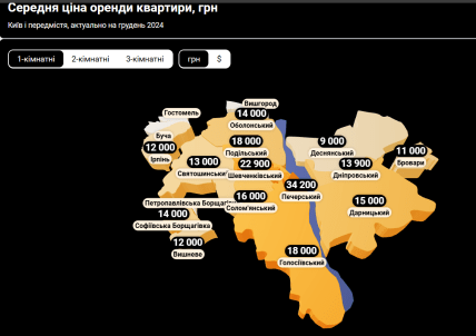 Найдоступніші для оренди однокімнатні квартири можна знайти в Дніпровському (13 900 гривень), Святошинському (13 000 гривень) та Деснянському (9 000 гривень) районах столиці.