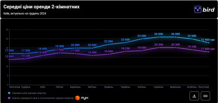 Вартість оренди 2-кімнатної квартири у Києві у листопаді 2024 року становить у середньому 23 тисячі гривень на місяць. За останні півроку ціна на оренду двокімнатної квартири в столиці зросла на 5%.