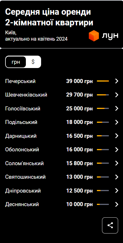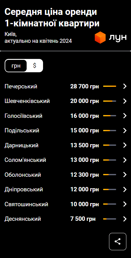 Найдоступніші для оренди однокімнатні квартири можна знайти в Дніпровському (12 000 гривень), Святошинському (10 000 гривень) та Деснянському (7 500 гривень) районах столиці.