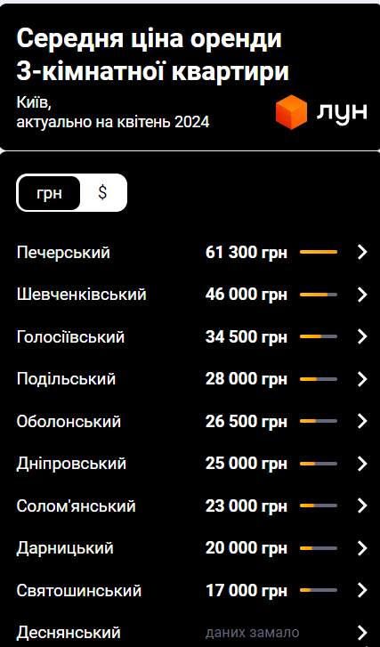Найдоступніші ж для оренди троячки можна знайти в Дарницькому (20 000 гривень) та Святошинському (17 000 гривень) районах столиці.