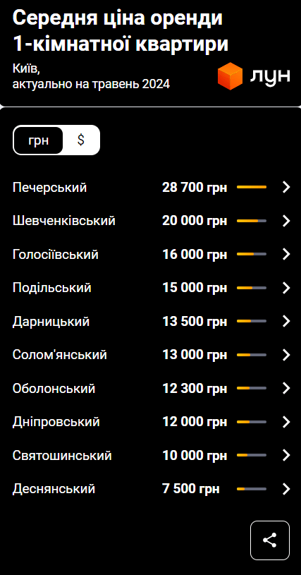 Найдоступніші для оренди однокімнатні квартири можна знайти в Дніпровському (12 000 гривень), Святошинському (10 000 гривень) та Деснянському (7 500 гривень) районах столиці.