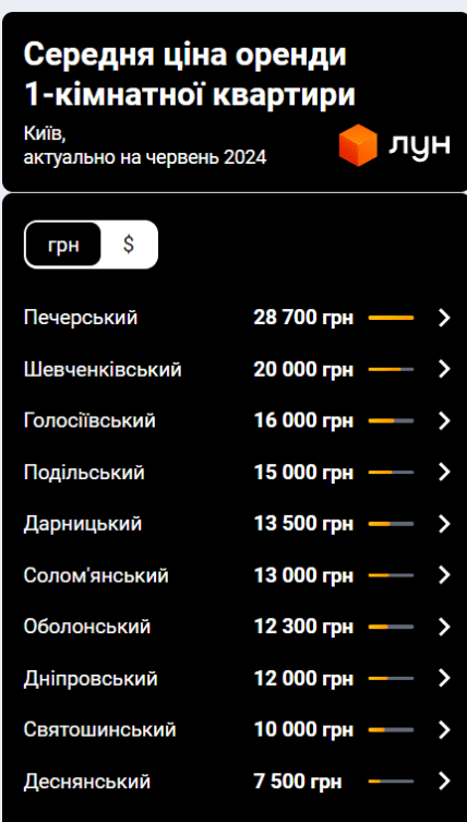 Найдоступніші для оренди однокімнатні квартири можна знайти в Дніпровському (12 000 гривень), Святошинському (10 000 гривень) та Деснянському (7 500 гривень) районах столиці.
