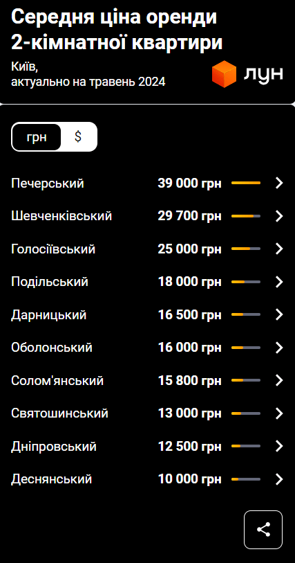 Найдоступніші для оренди однокімнатні квартири можна знайти в Дніпровському (12 000 гривень), Святошинському (10 000 гривень) та Деснянському (7 500 гривень) районах столиці.