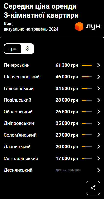 Найдоступніші ж для оренди квартири з трьома комнатами можна знайти в Дарницькому (20 000 гривень) та Святошинському (17 000 гривень) районах столиці.