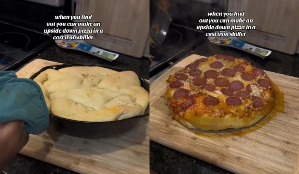 Блогерка приготувала перевернуту піцу на чавунній пательні, помістивши на дно сир і м’ясо, потім соус і тісто зверху.