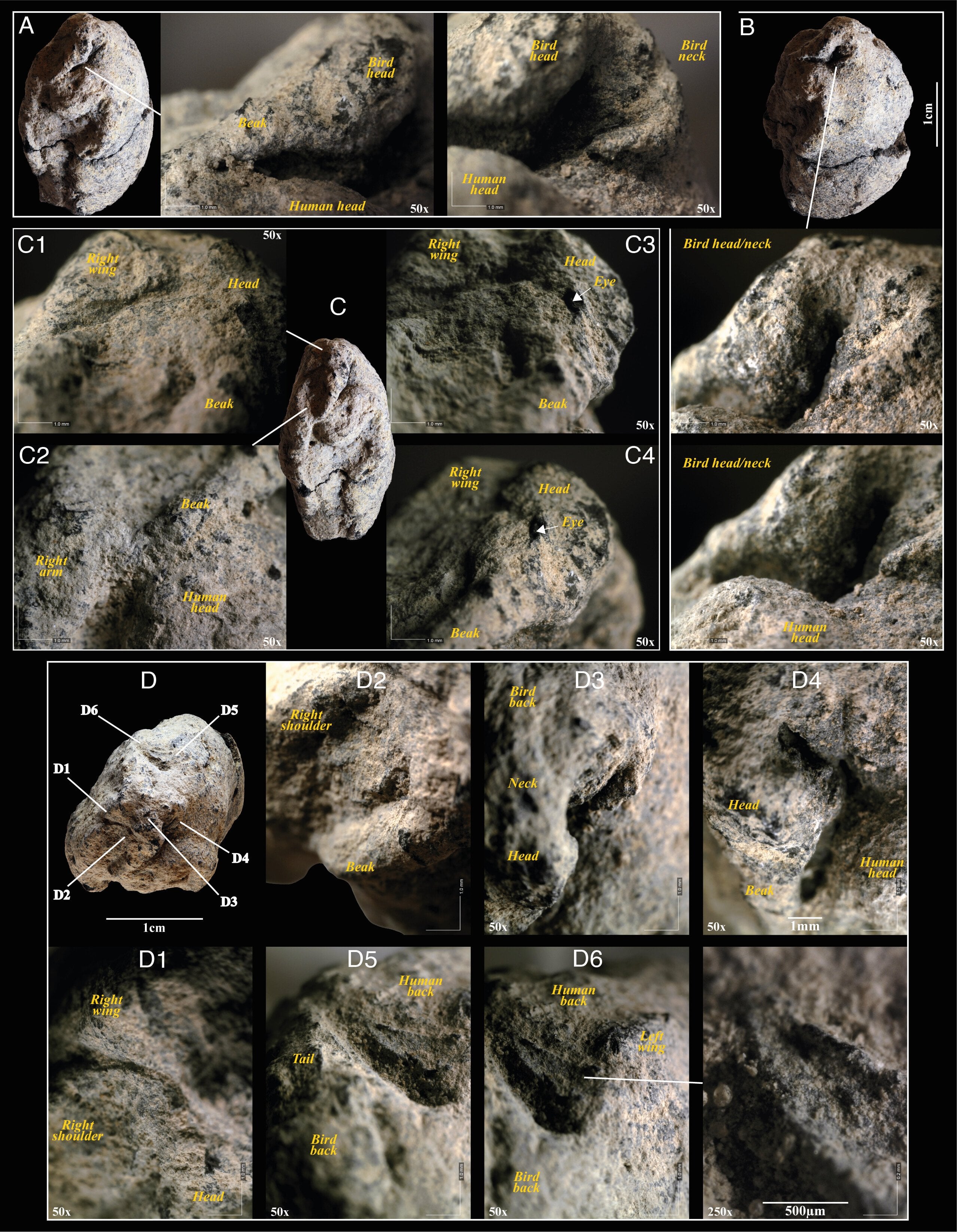 Позаду жіночої фігури розташована постать птаха, що ніби обіймає її своїми крилами. Найімовірніше, це зображення гусака, оскільки кістки цих птахів часто знаходять як на цій, так і на інших натуфійських стоянках.