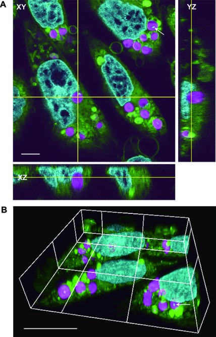 Органели зберігали свою структуру протягом 2 днів після впровадження і продовжували фотосинтезувати, будучи оточеними мітохондріями (органелами, які накопичують енергію), що може говорити про внутрішньоклітинну взаємодію. Проте на четвертий день їх структури було порушено, а активність знизилася.