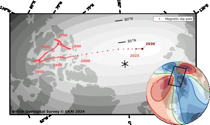 Позиція магнітного полюса (червоні точки) щодо географічного полюса (чорна зірочка)