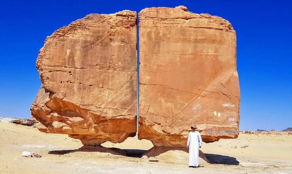 В оазі Тайман в Саудівській Аравії є одне з найзагадковіших геологічних утворень на Землі – на двох майже ідеальних постаментах знаходиться величезний валун діаметром близько 9 м, ідеально розколотий надвоє.