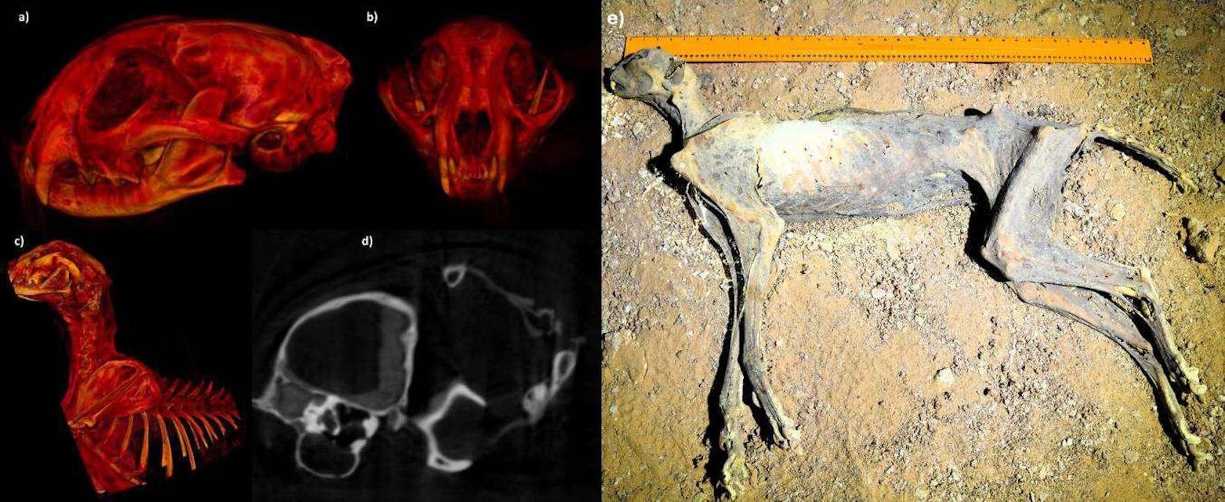 Реконструкція черепа та тканин мумії гепарда (зліва) й фото мумії на місці знахідки (справа). Boug et al., 2025