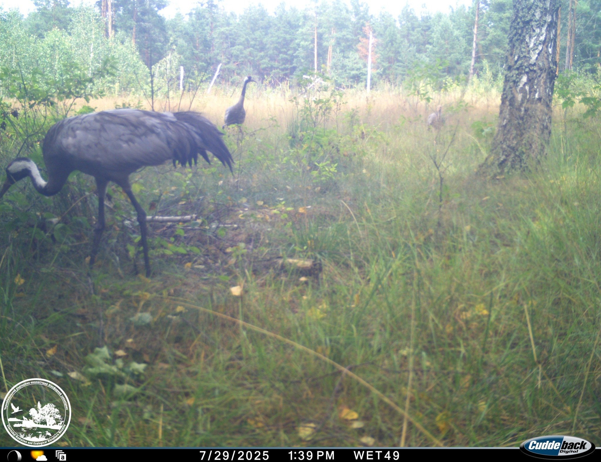 «Під час вивчення місць гніздування журавля сірого дослідники постійно працюють на водно-болотних угіддях, адже саме там ці величні птахи будують гнізда й виховують пташенят. Інколи трапляються й незвичайні зустрічі журавлів у лісах, коли дорослі птахи водять молодь. Такі моменти фіксують не лише під час польових спостережень, а й за допомогою фотопасток», — розповіли у заповіднику.