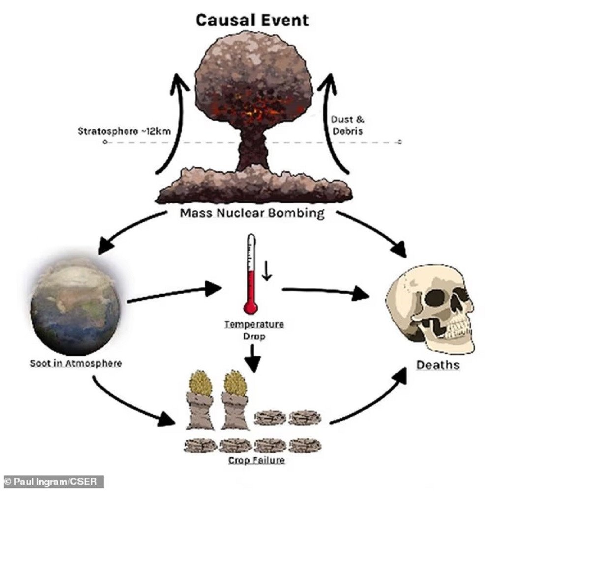 Після ядерних вибухів дим і сажа піднімуться у стратосферу, блокуючи сонячне світло. Через це температура значно впаде, сільське господарство зазнає краху, і почнеться глобальний голод, що вчені називають ядерною зимою.