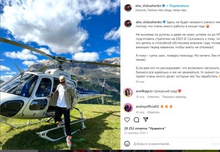 На кадрах з відпочинку присутні дорогі автомобілі марок Lamborghini, Maybach та інші, а також вертольоти і яхти — розмах шикарний. У подорожі Олександр Слобоженко їздить не один, а із друзями — також громадянами України призовного віку.