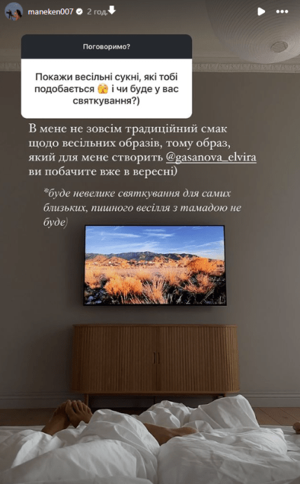 “В мене не зовсім традиційний смак щодо весільних образів, тому образ, який для мене створить Ельвіра Гасанова (український дизайнер — ред.) ви побачите вже в вересні“, — розповіла Манекен.